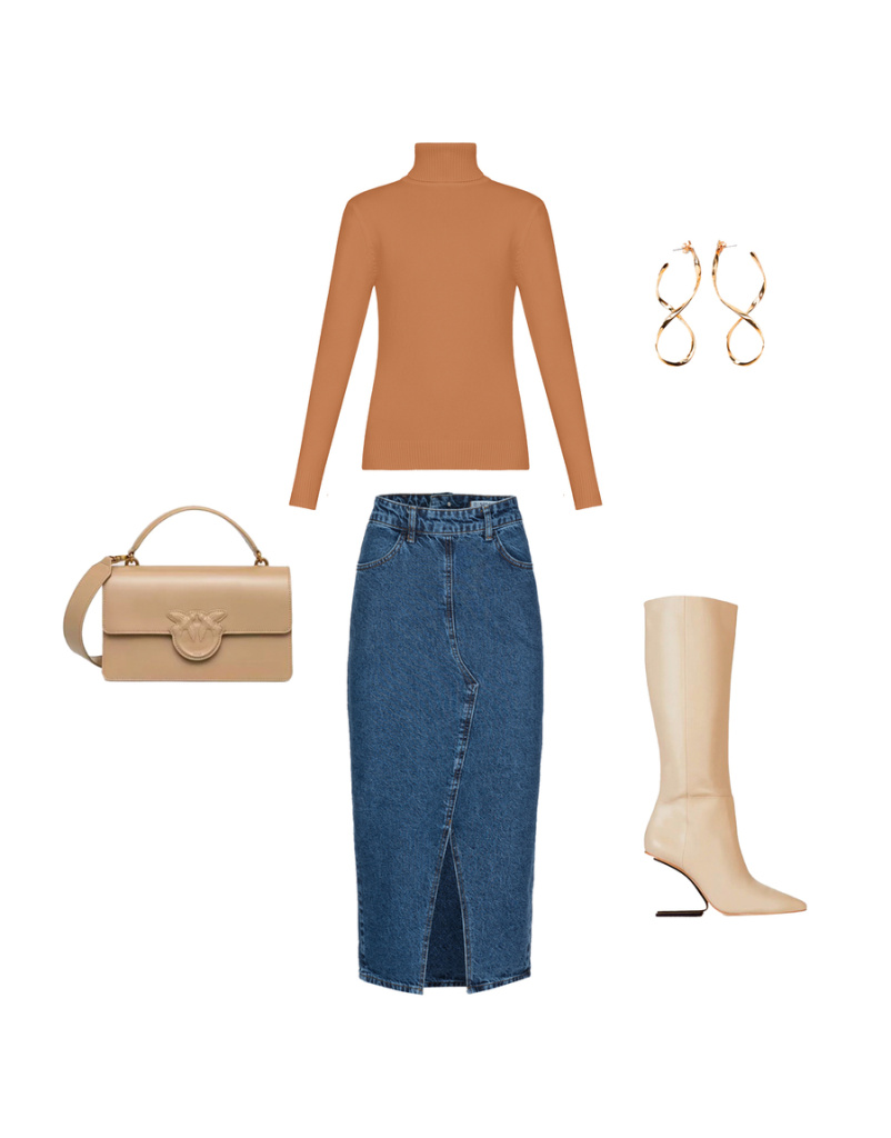 Dżinsowa spódnica za kolano to niebanalna alternatywa dla zwykłych jeansów. Tradycyjne połączenie dzianiny koloru camel i niebieskiego denimu w tym formacie prezentuje się w nowy sposób, podkreślając kobiecość i przytulność. Jasne kozaki i torebka to najlepsze uzupełnienie podstawowego looku. Polecamy poeksperymentować z dodatkami lub kształtem obcasów, aby dodać indywidualności.